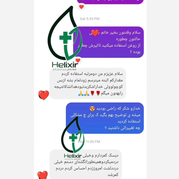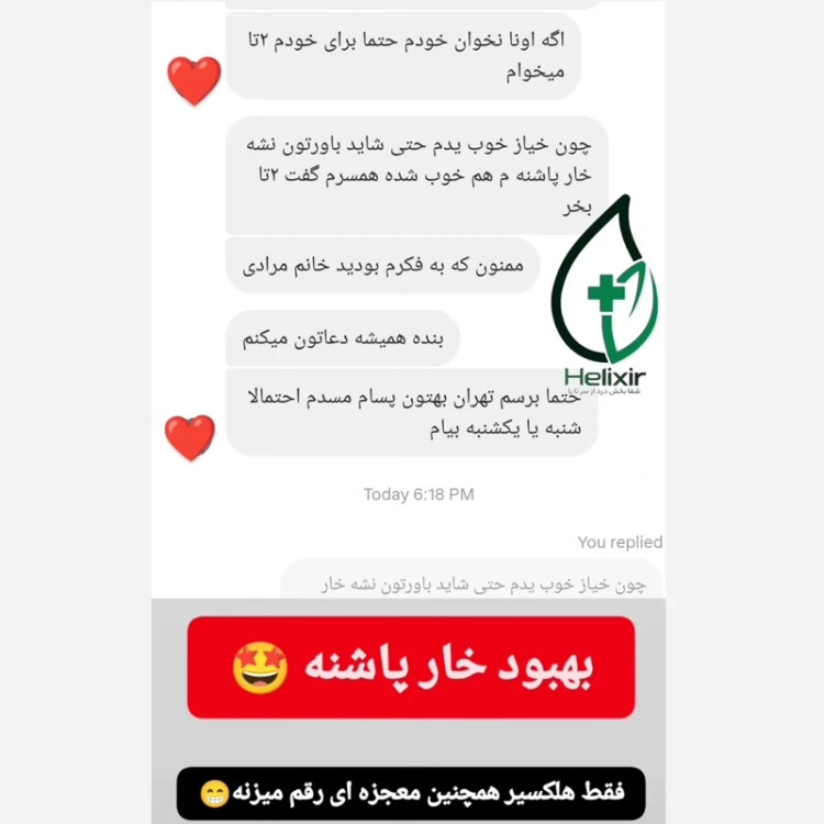 🌱حاوی نانو ذرات و یون های ترمیمی ک علاوه بر تسکین درد باعث ترمیم بافت آسیب دیده میشه ،شما بلافاصله بعد از مصرف تاثیر بی نظیر هلکسیر رو متوجه خواهید شد و از همه مهم تر طی مدت زمان 21 روز کاملا بهبود پیدا میکنید