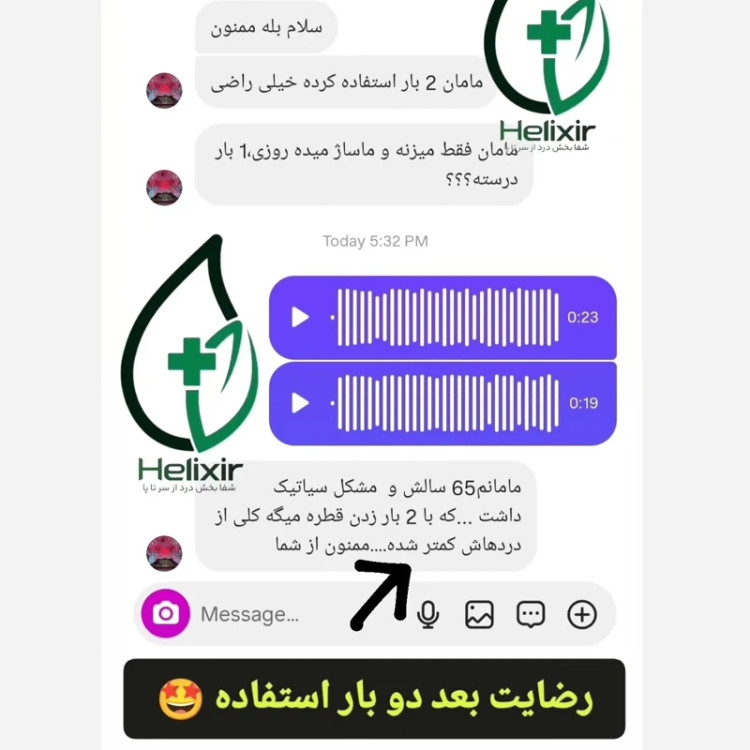 🌱حاوی نانو ذرات و یون های ترمیمی ک علاوه بر تسکین درد باعث ترمیم بافت آسیب دیده میشه ،شما بلافاصله بعد از مصرف تاثیر بی نظیر هلکسیر رو متوجه خواهید شد و از همه مهم تر طی مدت زمان 21 روز کاملا بهبود پیدا میکنید