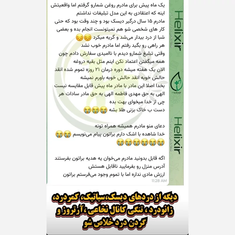 🌱حاوی نانو ذرات و یون های ترمیمی ک علاوه بر تسکین درد باعث ترمیم بافت آسیب دیده میشه ،شما بلافاصله بعد از مصرف تاثیر بی نظیر هلکسیر رو متوجه خواهید شد و از همه مهم تر طی مدت زمان 21 روز کاملا بهبود پیدا میکنید